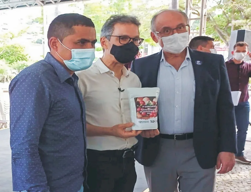 PREFEITO HENRIQUE ENTREGA AO GOVERNADOR ROMEU ZEMA UMA AMOSTRA DO NOSSO CAFÉ DE ARAPONGA